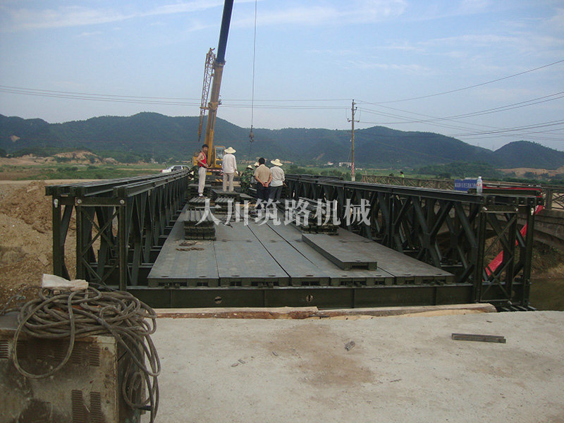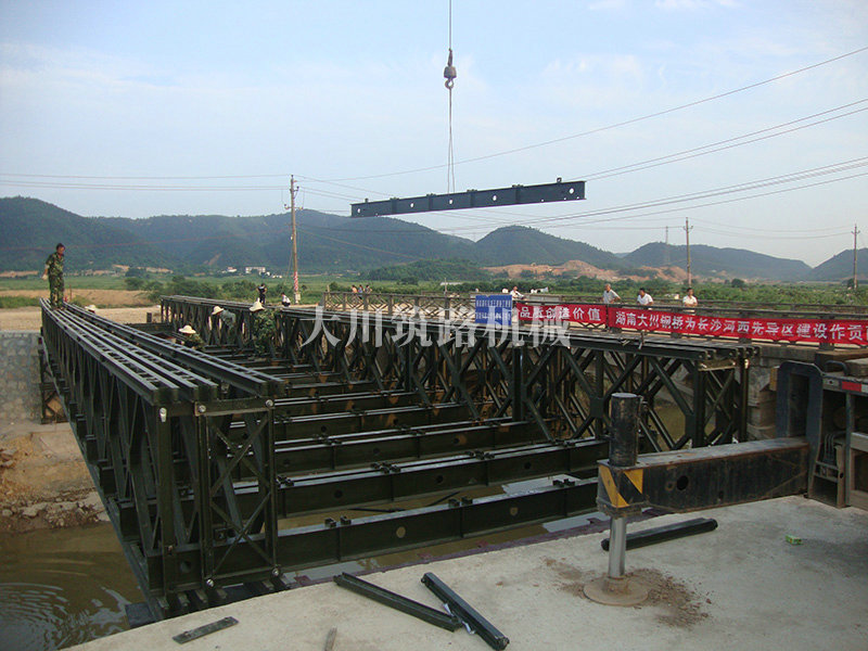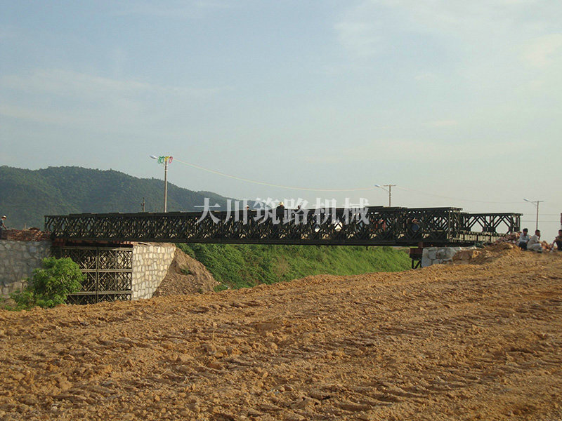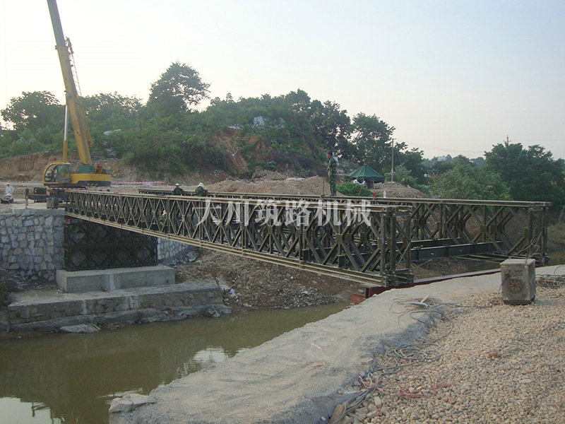 特點(diǎn):本鋼橋由國防科技大學(xué)全程指導(dǎo)和監(jiān)督安裝,滿足荷載80T施工車輛通行,因施工場地要求,采用貝雷梁組合式橋墩,安裝拆除方便,穩(wěn)定性好。采用推出法安裝,安裝周期20天,于2011年5月25日通車。