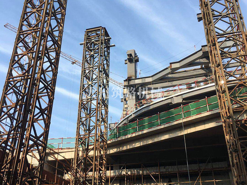 基本情況:部分構(gòu)件工廠組裝好,分片運(yùn)輸至現(xiàn)場(chǎng)。采用4片321型貝雷片組合而成的貝雷方柱作為大跨度鋼桁架下部的臨時(shí)支撐胎架,待上部鋼桁架安裝完成后分級(jí)卸載,最后分片拆除。拆卸后鋼桁架撓度符合要求。貝雷方柱支撐胎架高度達(dá)20m,支撐荷載約50t。